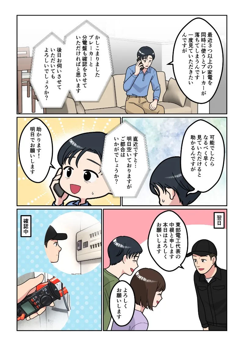 旦那「最近3つ以上の家電を同時に使うとブレーカーが落ちてしまうんです。一度見ていただきたいんですが」